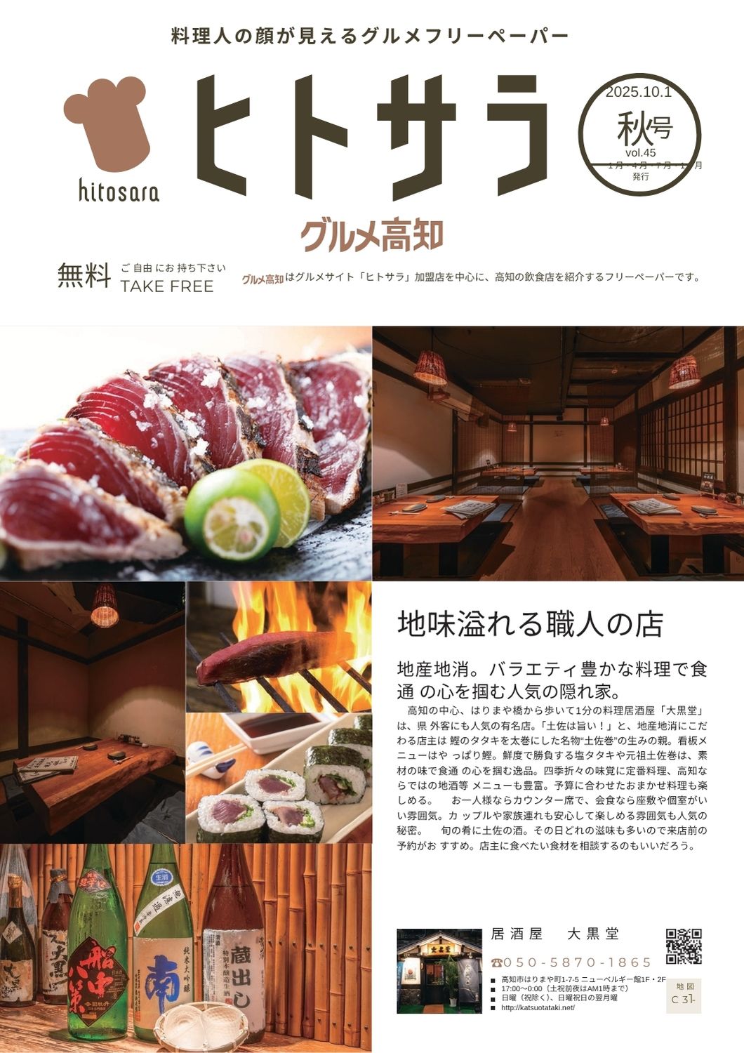 「ヒトサラグルメ」2025年 秋号が10/1に発刊しました!2025年10月2日 ヒトサラに載っている高知の飲食店を紹介する「ヒトサラグルメ」秋号が10/1に発刊しました! ヒトサラに載っている高知の飲食店を紹介する「ヒトサラグルメ」秋号が10/1に発刊しました!